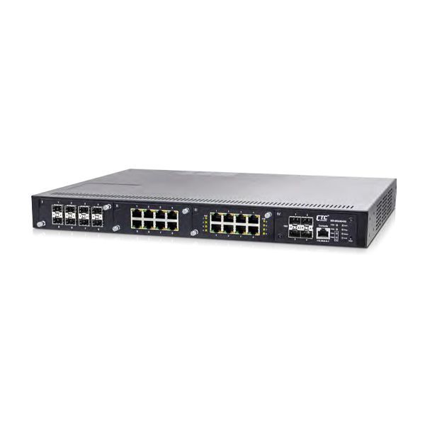 - 模組化端口設計:提供高達 24 埠 Gigabit 乙太網路接口,支援三種模組,彈性應用-銅纜模組(RJ45)、PoE(供電)模組、SFP(光纖)模組。