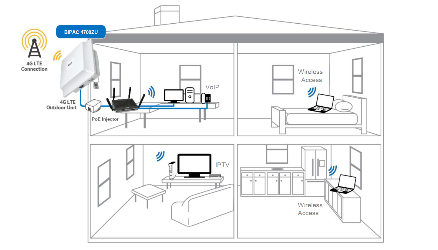 - 位處於無線寬頻信號較弱或一般無線寬頻信號無法正常涵蓋區域的用戶往往面臨網路連線不穩定的問題,無論是LOS(可視範圍)還是 NLOS(非可視範圍),BiPAC 4700ZU搭配高功率的MIMO天線技術均能為此問題提供最佳解決方案。