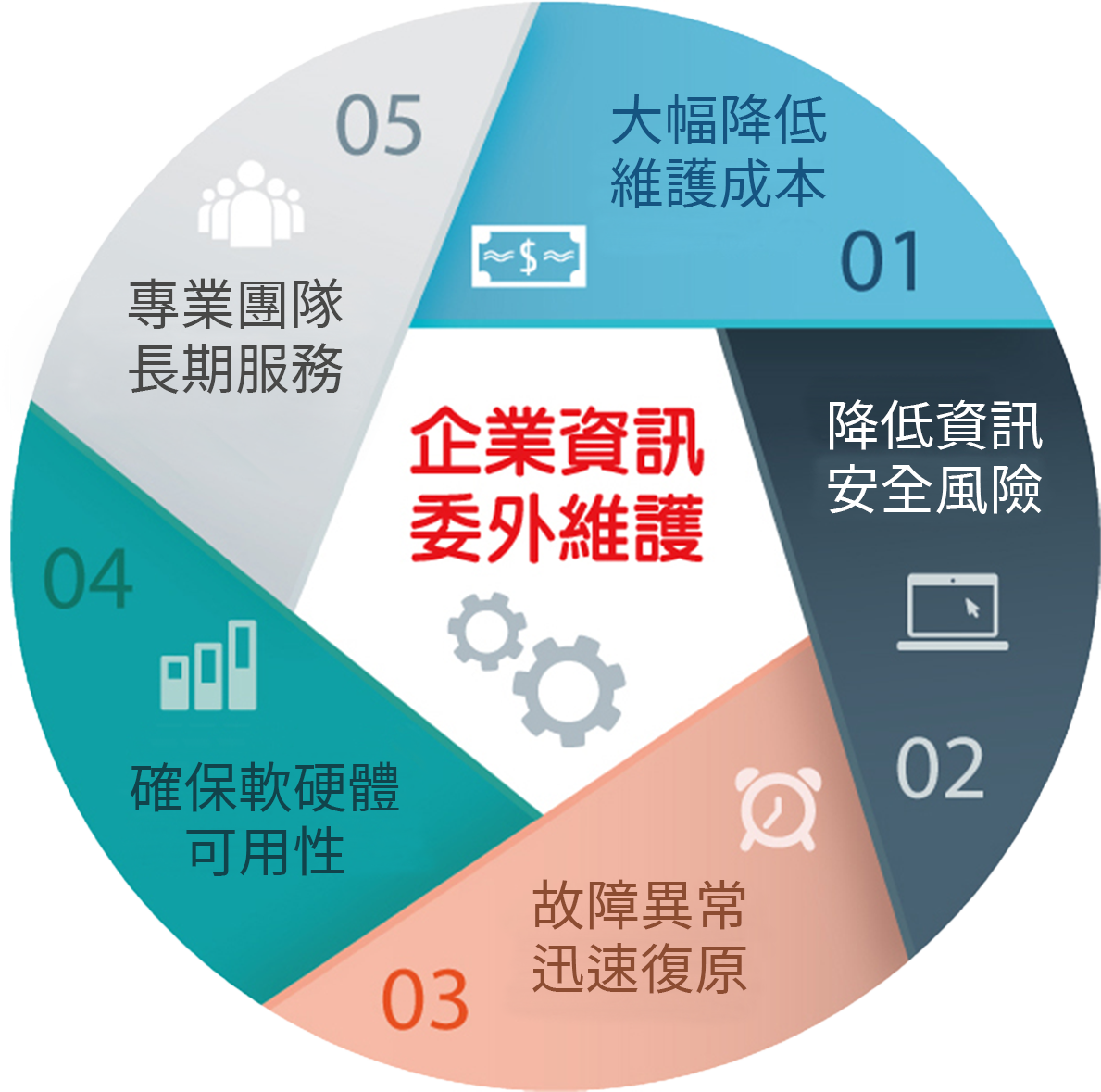 『聞道有先後,術業有專攻』企業掌握自己的核心事業,而將非專長領域的IT資訊事務委外給專業資訊廠商,並能以較低的成本來獲得專業的資訊服務。